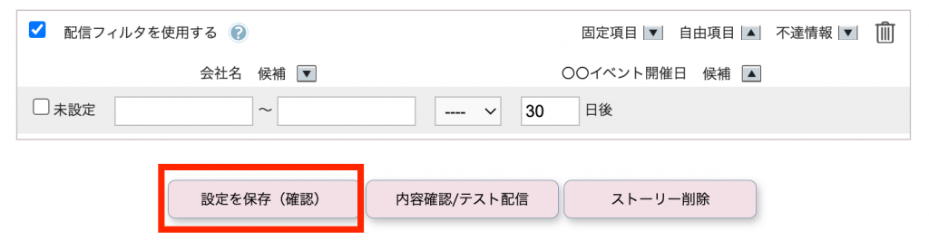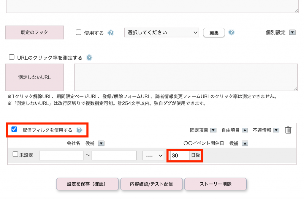 「ストーリー (新規) の設定」画面内で 「配信フィルタを使用する」にチェックを入れ、自由項目「〇〇イベント開催日」に「30日後」(〇〇イベント開催日の30日前にメールを自動送信)を設定する