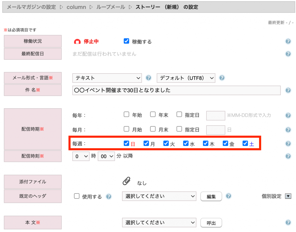 表示される「ストーリー (新規) の設定」画面内で「配信時期※」の「毎週」項目の日月火水木金土すべてにチェックを入れる(毎日配信判定が行われるようにする)