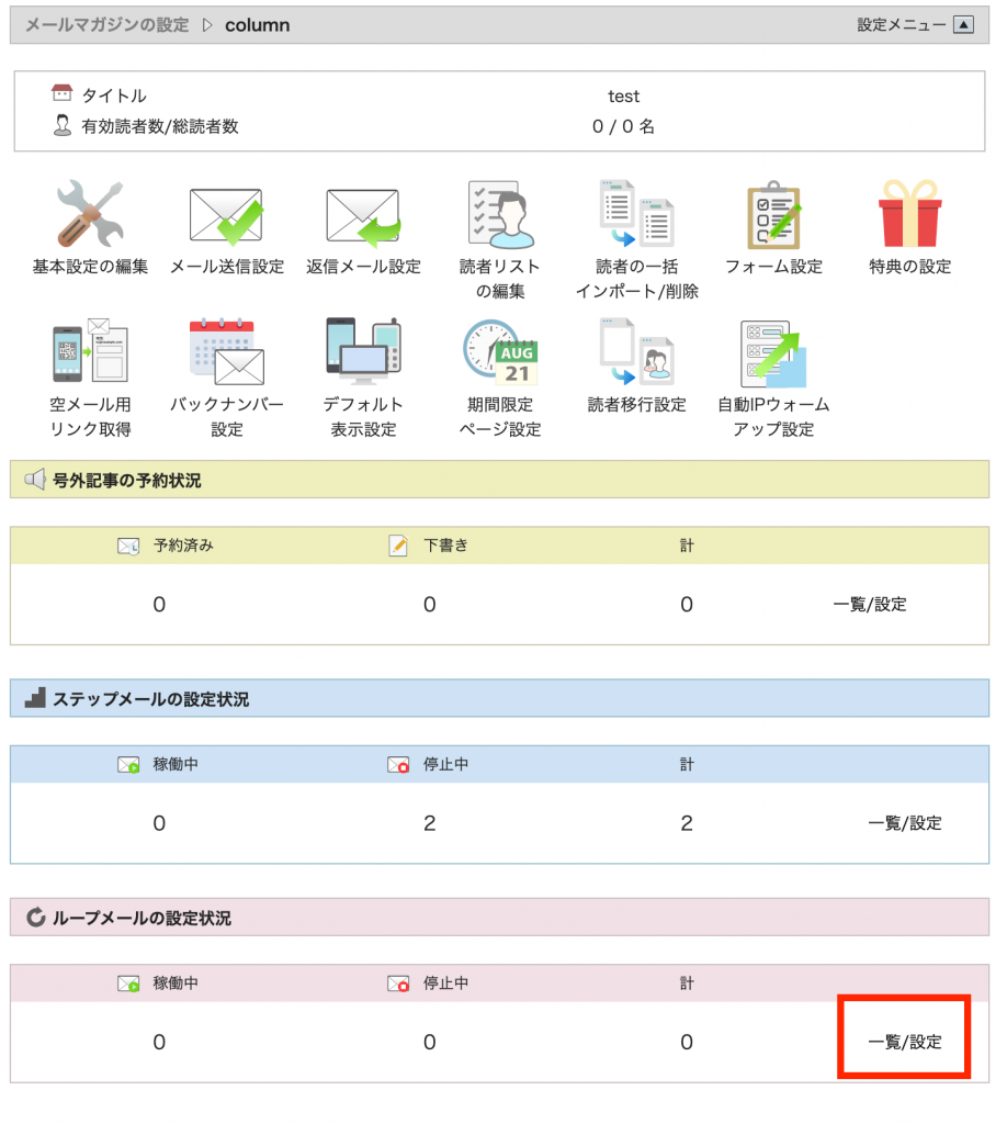 メルマガIDの設定メニュー一覧画面にて、「ループメールの設定状況」内の「一覧/設定」を押下する