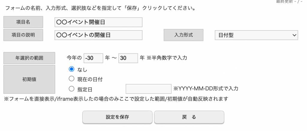 そのために、まず初めに入力形式が「日付型」の自由項目を追加します。