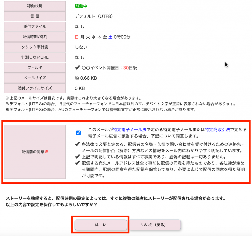 表示される「設定の確認」画面内の配信前の同意を確認しチェックを入れ、「はい」ボタンを押下する