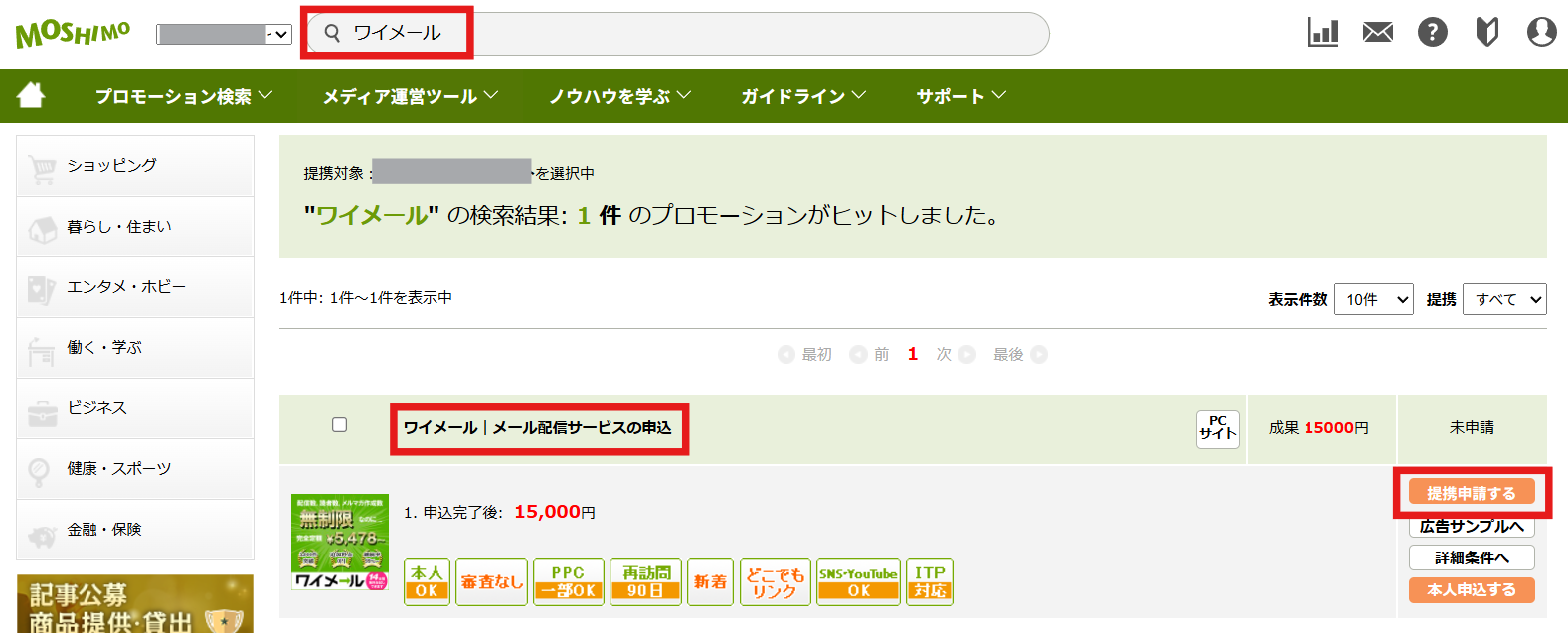 当プロモーション「ワイメール|メール配信サービスの申込 」が検索結果に表示されますので、「提携申請する」ボタンをクリックして提携申請します。